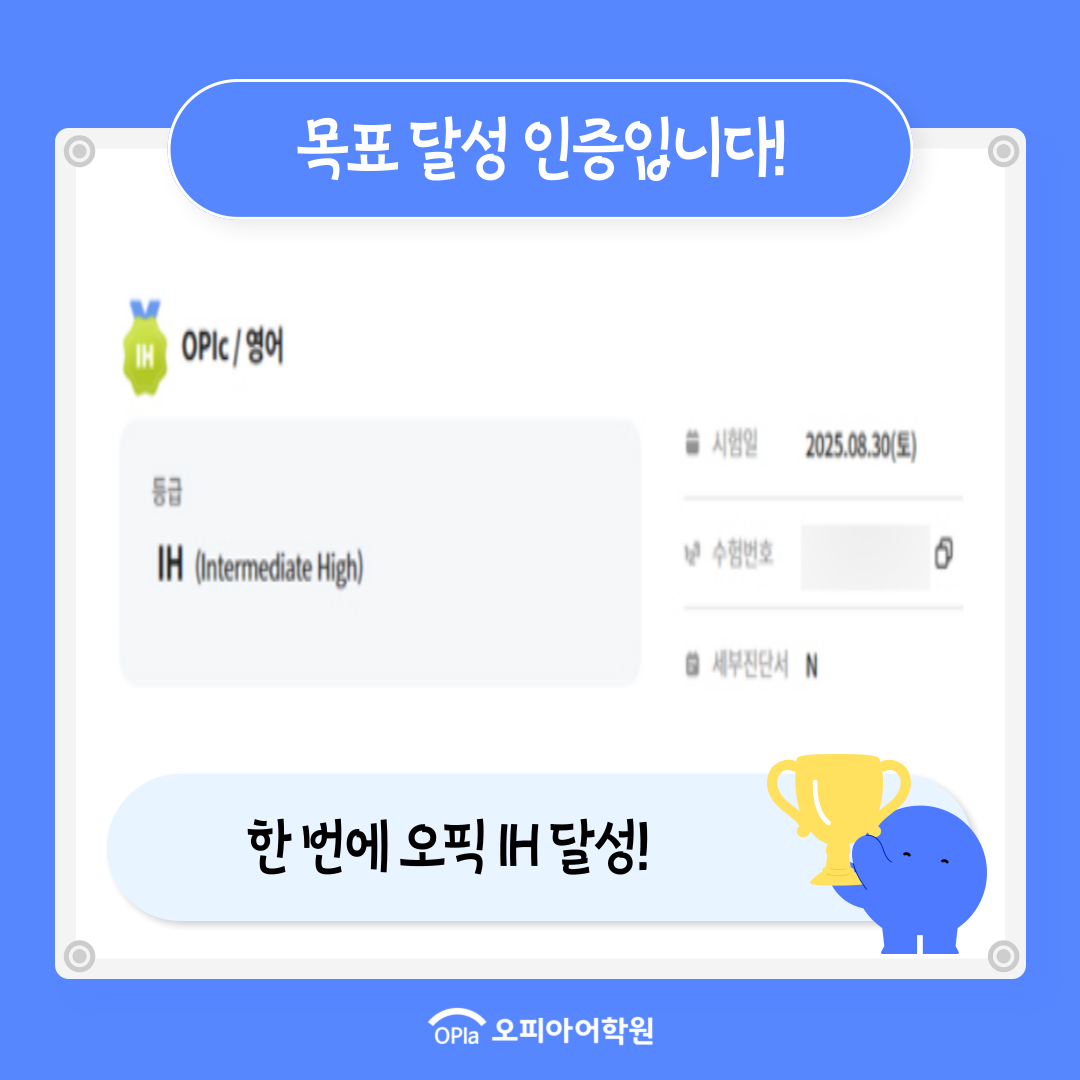 단기간에 목표 등급인 오픽 IH를 획득하셨습니다.