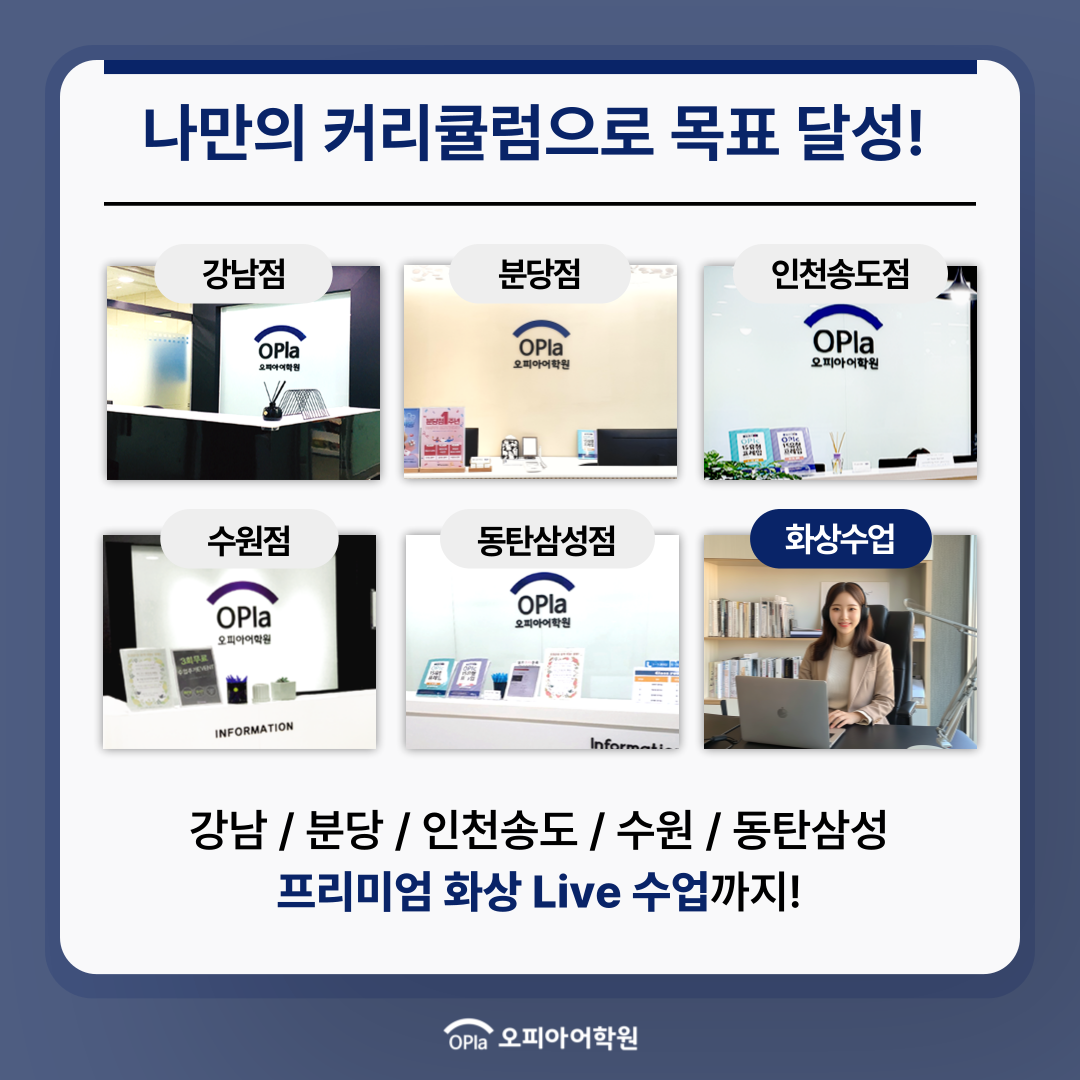 오피아어학원은 수원, 강남, 인천송도, 동탄삼성, 분당