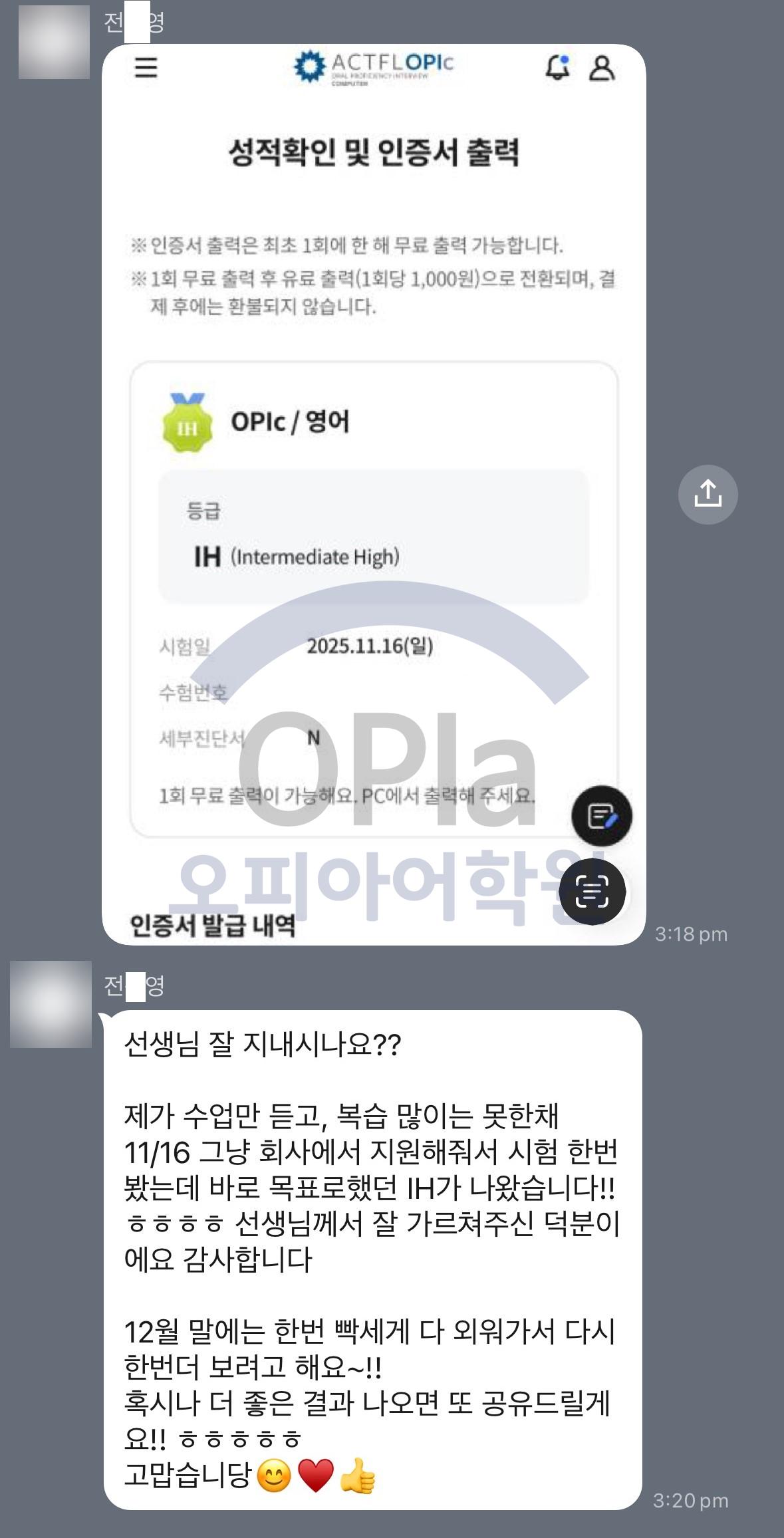 목표했던 IH 등급을 달성할 수 있겠다는 강한 자신감을 얻게 되었습니다.